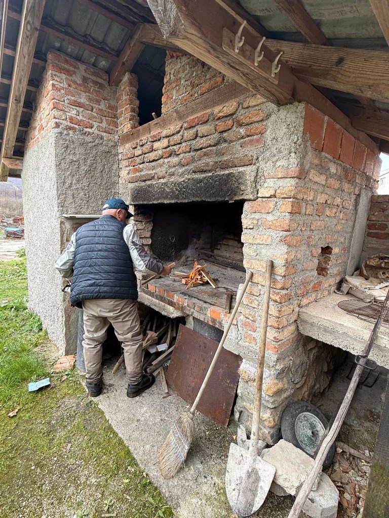 Cooking sausages over an open fire at lunch.